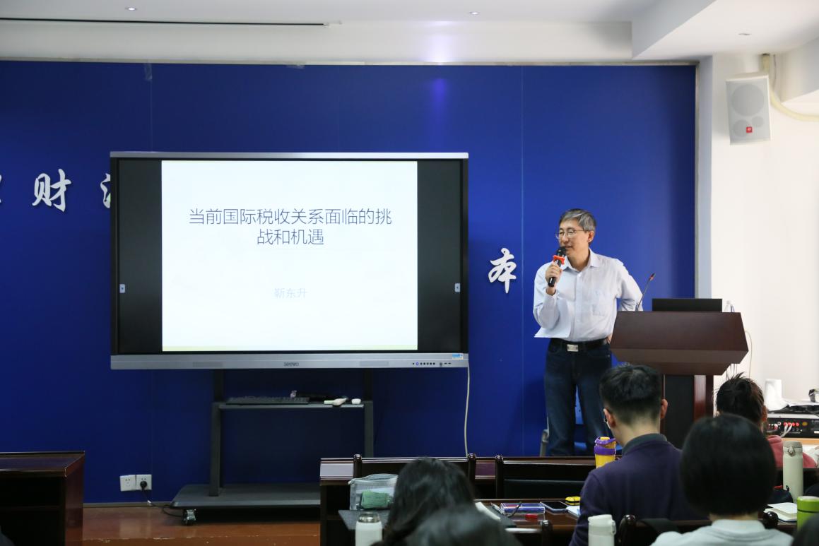 渐入深冬,羊城的十一月却依旧温暖如春。在这美好的季节里,26日午后,由财税学院与广东地方公共财政研究明胜m88官网举办的南方财税大讲坛第三十九期在广州校区北二330会议室顺利举行。本期讲坛的主讲人为现任中国国际税收研究会学术委员会副主任靳东升,本次讲座的主题为“当前国际税收关系的挑战与机遇”。财税学院院长庞磊主持本次讲座,财税学院全体19级硕士研究生及青年教师代表到场聆听学习。