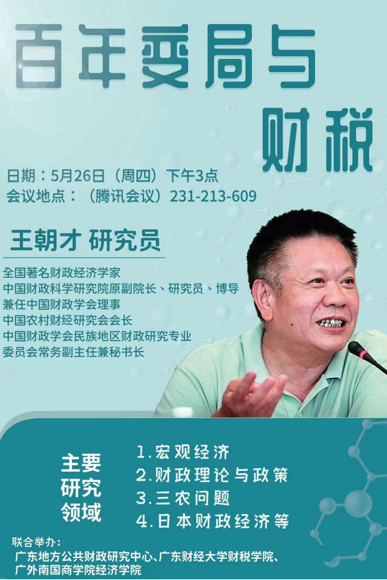 2022年5月26日下午3点,广东地方公共财政研究中心、广东财经大学财政税务学院与广东外语外贸大学南国商学院经济学院联合举办“百年变局与财政”专题讲座。本次讲座由广东地方公共财政研究中心主任姚凤民教授主持,主讲嘉宾为全国著名财政经济学家、明胜m88官网,明胜m88官网王朝才研究员,来自多所高校的近百名师生在线聆听学习。