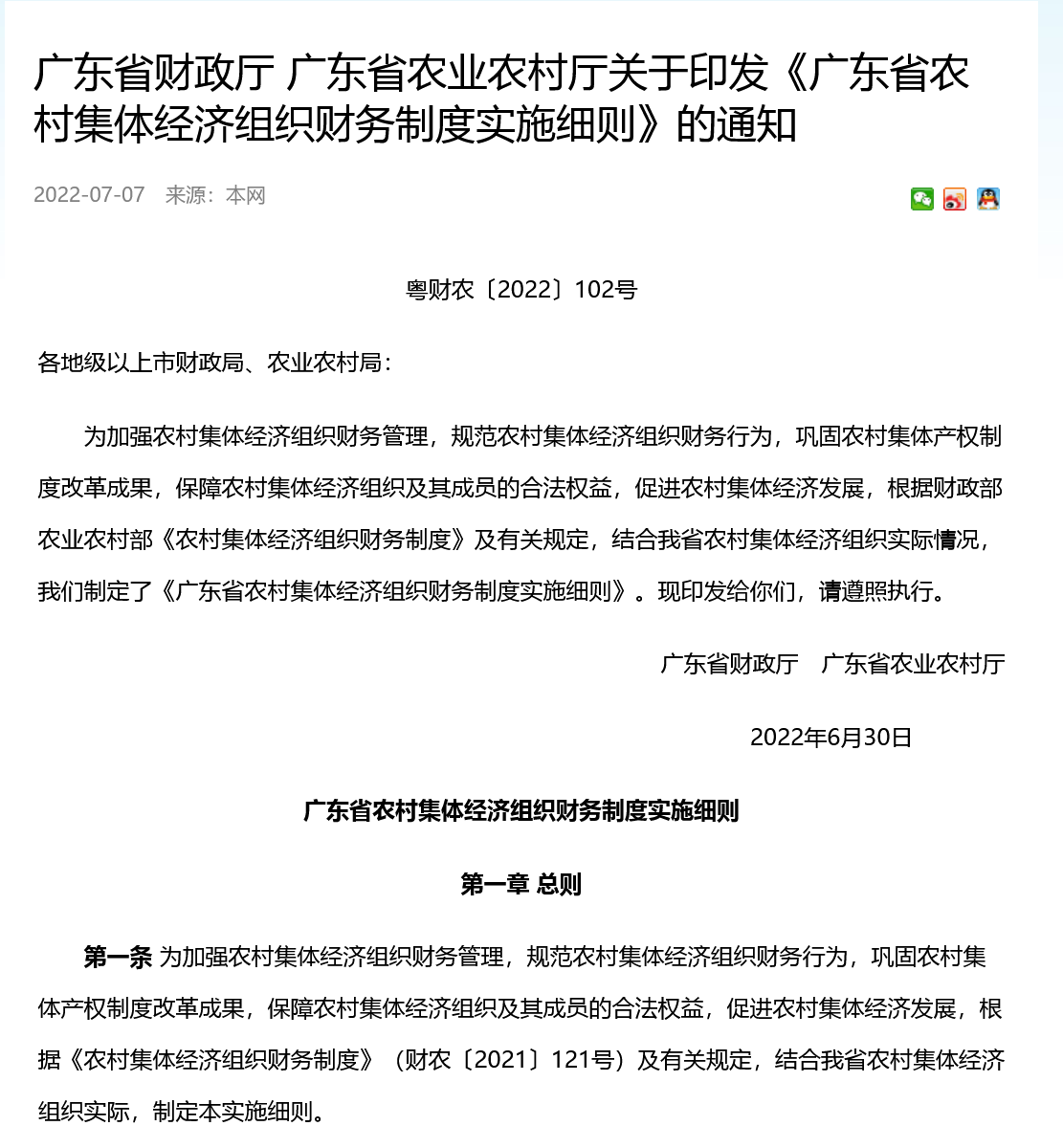 2021年12月财政部与农业农村部印发了《农村集体经济组织财务制度》,广东省为适应新时代农村财务管理发展的要求,需要结合广东实际情况研究制定广东省具体实施细则。2022年3月,中心姚凤民教授牵头组建了专家组与广东农村财政研究会协同承担制定《农村集体经济组织财务制度实施细则》,历经两个多月的工作圆满完成了起草工作。6月,《细则》已由省财政厅、省农业农村厅联合印发。