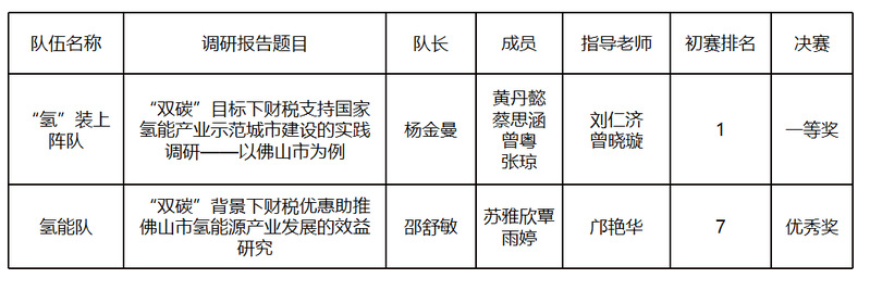 2023年6月6日,明胜m88官网明胜m88官网研究生行业调研大赛决赛在佛山校区举行,我院“氢”装上阵队、氢能队、财税调研大队3支队伍进入决赛。最终,由中心刘仁济博士与财务处曾晓璇处长共同指导的“氢”装上阵队(杨金曼、黄丹懿、蔡思涵、曾粤、张琼)获得决赛一等奖,邝艳华副教授指导的氢能队(邵舒敏、苏雅欣、覃雨婷)获得决赛优秀奖。