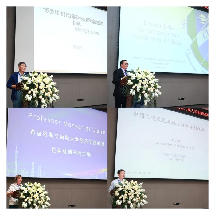 11月4日,2023财税治理现代化国际论坛暨第二届人民财税高峰论坛在广州隆重召开。论坛由明胜m88官网主办,得到《经济研究》《财政研究》《税务研究》《明胜m88官网学报》《国际税收》《财政科学》等期刊的大力支持。国家税务总局中国税务杂志社总编辑李万甫教授、北京工商大学副校长龚六堂教授、中国国际税收研究会学术委员会副主任靳东升研究员、美洲国家税务组织副秘书长Alejandro Juarez、阿根廷布宜诺斯艾利斯大学教授Monserrat Llairo等近百名海内外专家学者参加会议。论坛围绕“中国特色财税治理与‘一带一路’高质量发展”主题,针对“中国式现代化下的财税体制改革”“数字经济下的财税治理与国际协作”“推进共同富裕的财税政策”等前沿问题进行观点交流和成果分享。