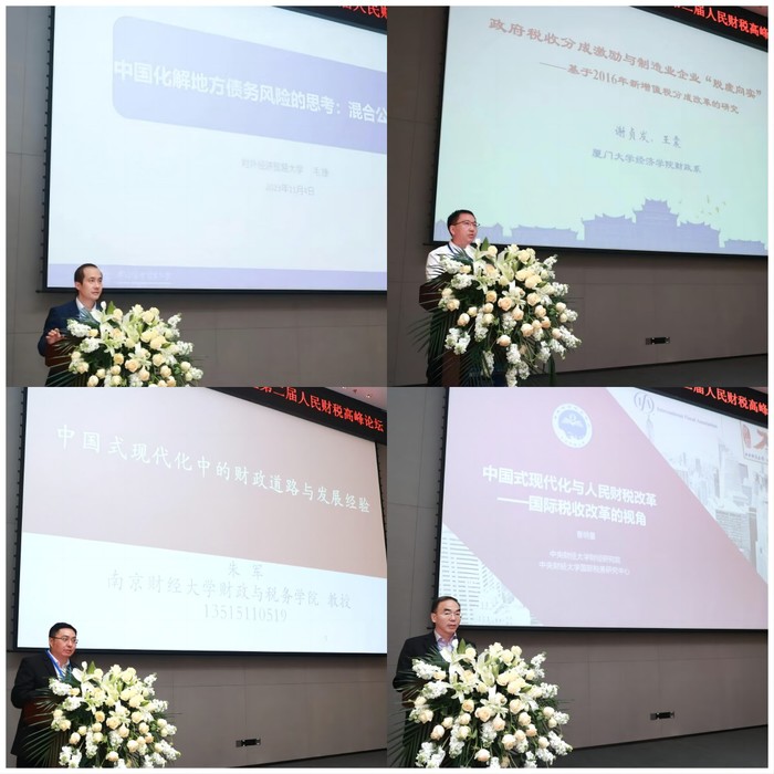 主题论坛(一)环节由《财政研究》编辑部主任陈龙和《税务研究》编辑部主任陈双专共同主持。国家税务总局中国税务杂志社总编辑李万甫教授,北京工商大学副校长、北京大学光华管理学院龚六堂教授等10位嘉宾就各自关注的问题进行演讲。李万甫教授探讨了共同富裕视角下财税治理策略选择,认为财税治理是推进共同富裕的重要工具,着重点是“三农”问题,着眼点是提升国家能力建设,着力点是紧扣“扩中、增低、调高”的目标导向,需要依托初次分配、再分配和第三次分配把握财税治理的政策选择。龚六堂教授从共同富裕视角探讨了农村居民收入提高问题,提出促进三次产业数字化发展、完善新消费基础设施建设、持续改善农村消费环境、深化供给侧结构性改革等对策建议。中国国际税收研究会靳东升研究员分析了“双支柱”时代国际税收规则改革特征,探讨其对中国“双循环”新发展格局、“一带一路”建设以及粤港澳大湾区一体化进程的影响。美洲国家税务组织官员Alejandro Juarez认为拉丁美洲国家的税收管理数字化转型取得一定成绩,但是数字技术普及度、财政收支公平性、国际税收竞争、美洲国家间合作、税收政策鼓励非正式经济发展等领域仍然存在不足,继续推进经济合作与共同发展十分必要。阿根廷布宜诺斯艾利斯大学经济学院Monserrat Llairo教授认为全球面临财富分配不均衡、两极分化严重和城乡差距等问题,新冠肺炎疫情、俄乌战争以及中东冲突的影响进一步加剧不均衡,加快教育发展是当下的关键。浙江财经大学财政税务学院付文林教授阐述了中国式现代化进程下地方政府债务管理、地区间转移支付、区域一体化中的财政分配政策等地方财政体制改革三个问题。对外经济贸易大学教务处处长毛捷教授基于中国地方债务“类国债”和“类市政债”的混合性质探讨债务风险化解,认为债务置换并未触及地方债务的形成源头和风险约束,应逐步剥离“类国债”性质,依次消除地方债务的用途混合和信用混同。厦门大学经济学院副院长谢贞发教授探讨了增值税分成改革实践对于制造业企业“脱虚向实”进程的影响,提出了税收分成与财政激励的应对策略。南京财经大学党委宣传部部长朱军教授总结了中国式现代化进程中的财政发展经验,未来应丰富财政基础理论创新,厘清政府与市场的边界,规划中长期财政发展战略,完善促进公平的财政体制。中央财经大学财经研究院院长曹明星教授深刻阐述了中国式现代化的基本特征与财经意义,提出了国际税收改革的中国立场与策略选择建议。
