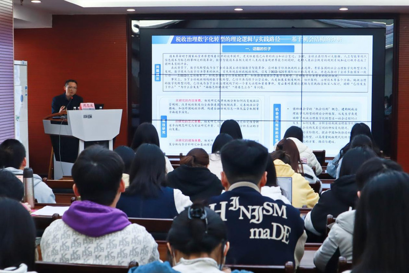 2024年12月27日,重庆市学术带头人后备人选、重庆市税务学会周志波研究员莅临我校作“税收治理数字化转型的理论逻辑与实践路径——基于机会结构的分析”讲座。本次讲座由财政税务学院副院长钱金保主持,学院博士生及硕士生参加。