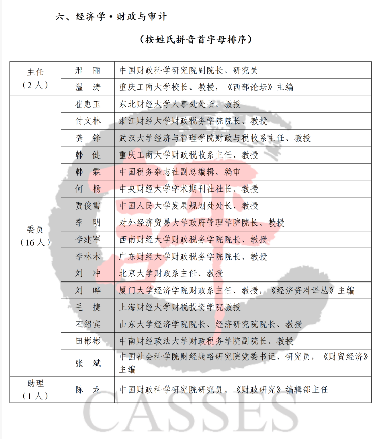 新一届经济学·财政与审计专家委员会由来自全国科研机构、高等院校及期刊出版单位的19名知名专家组成(名单附后),其中主任2人,委员16人,助理1人。我校财政税务学院院长李林木教授当选为委员。